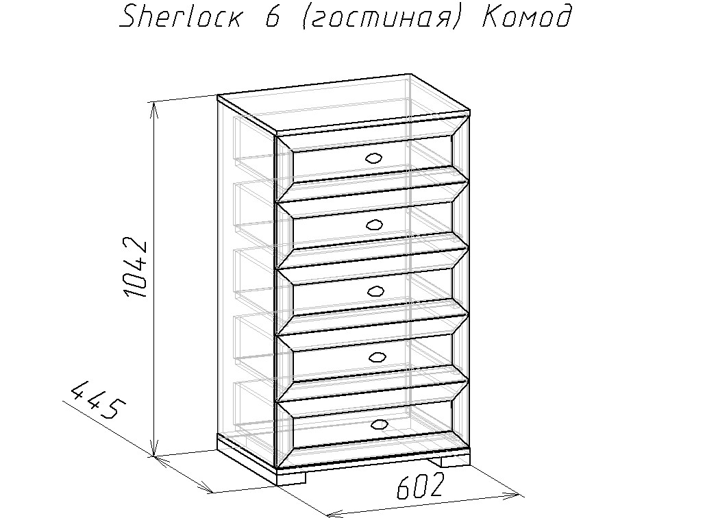 Высокий комод в спальню или в гостиную с пятью ящиками на шариковых направляющих позволит рационально использовать площадь комнаты. Повесьте над ним Шерлок зеркало 7 и эргономичный вариант для быстрого макияжа готов. Ящики глубиной 35 см, высотой 14 см, шириной 54 см выдерживают нагрузку до 20 кг каждый.