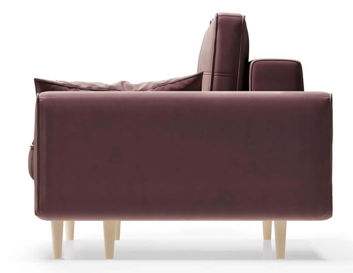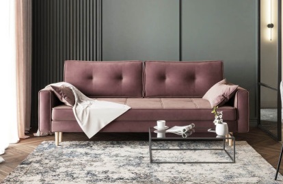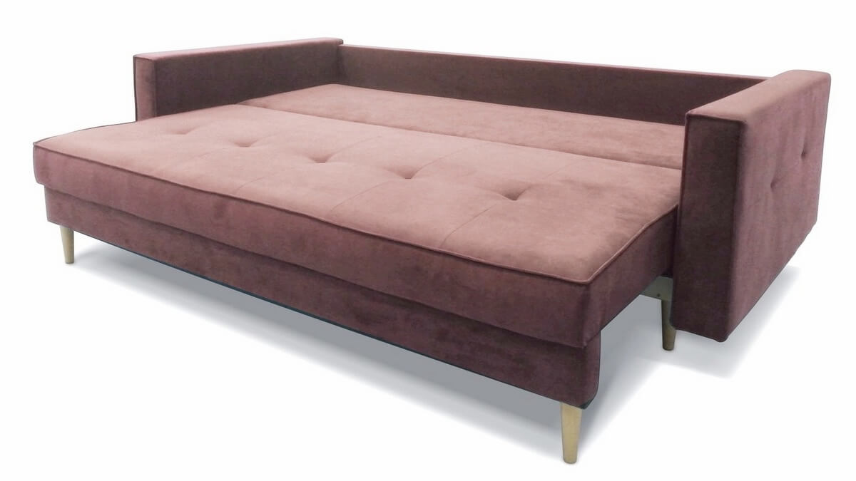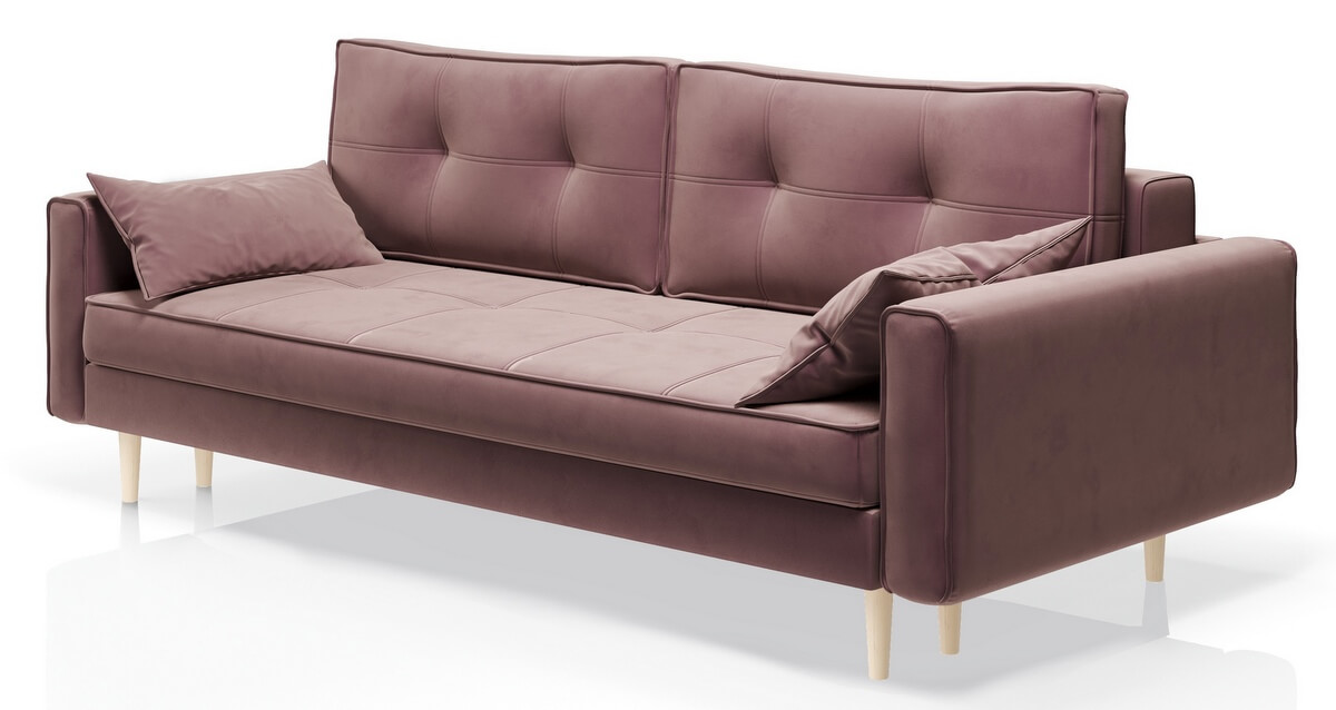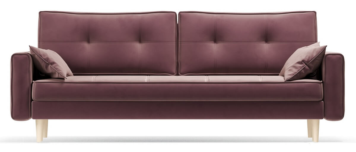 Диван имеет систему трансформации «тик-так». Так же диван укомплектован двумя большими подушками в единой ткани с диваном. Имеет небольшой короб для хранения.