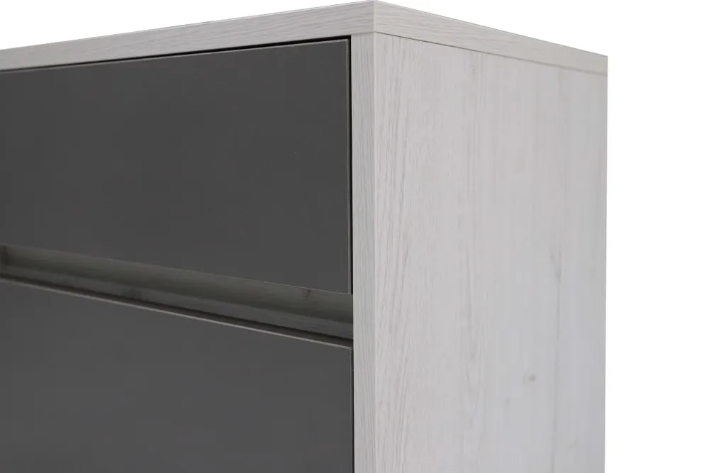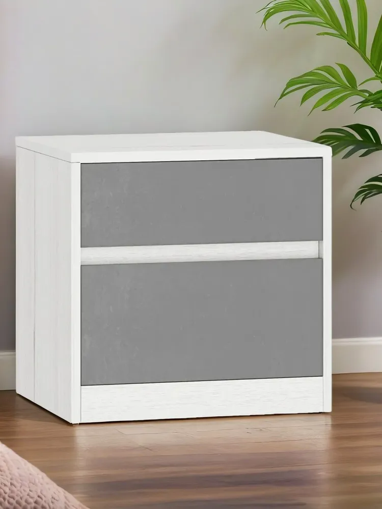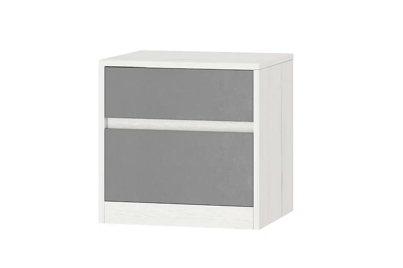Прикроватная тумба идеально впишется в интерьер спальни в серии "Нильс" в трендовом сочетании графитового и фактурного белого.
