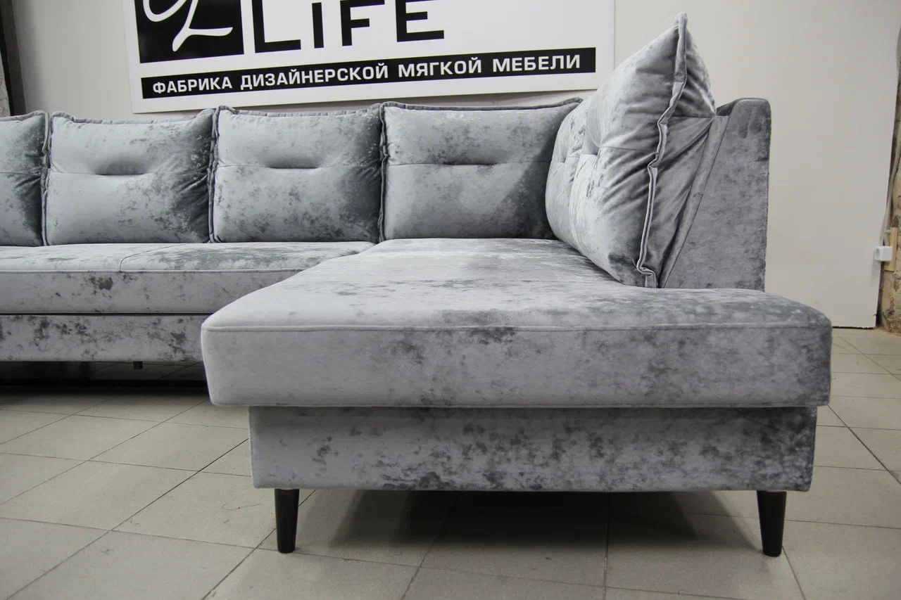 Диван Софи установлен на высокие устойчивые деревянные ножки, высоты достаточно для комфортной самостоятельной уборки или с помощью робота-пылесоса.