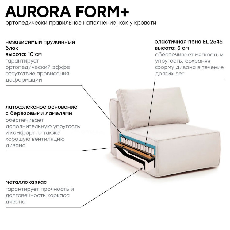 Наполнение | AURORA FORM+ (Латофлексное основание, независимый пружинный блок 100мм, термополотно, ППУ марки 50HR 35-плотность, 35-жесткость, наполнение высотой 150мм) |